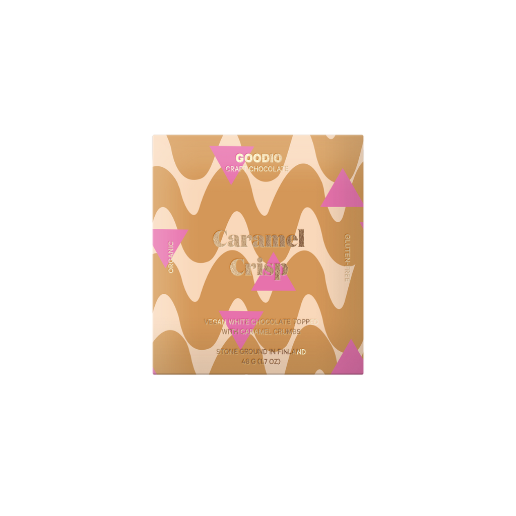 Diese vegane weiße Schokolade wird durch den knusprigen Karamell-Crunch obenauf noch perfekter. Alle Produkte werden stolz mit Liebe in Finnland – dem glücklichsten Land der Welt – von Goodio Chocolate Artists hergestellt.